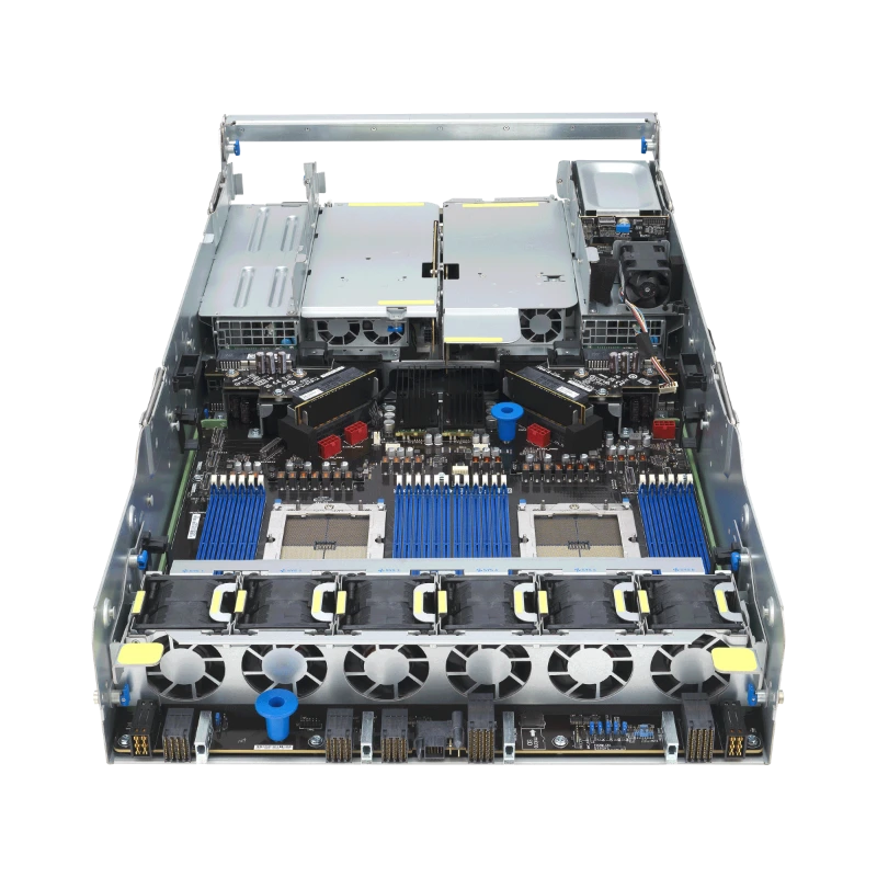 Lưu trữ: Mặt trước máy trang bị 8 khay ổ cứng 2.5 inch hỗ trợ hoàn toàn chuẩn NVMe siêu tốc. Ngoài ra còn có thêm các khay ở phía sau và 2 khe cắm M.2 PCIe Gen5 dành cho ổ khởi động hệ điều hành, đảm bảo tốc độ truy xuất dữ liệu nhanh nhất hiện nay.