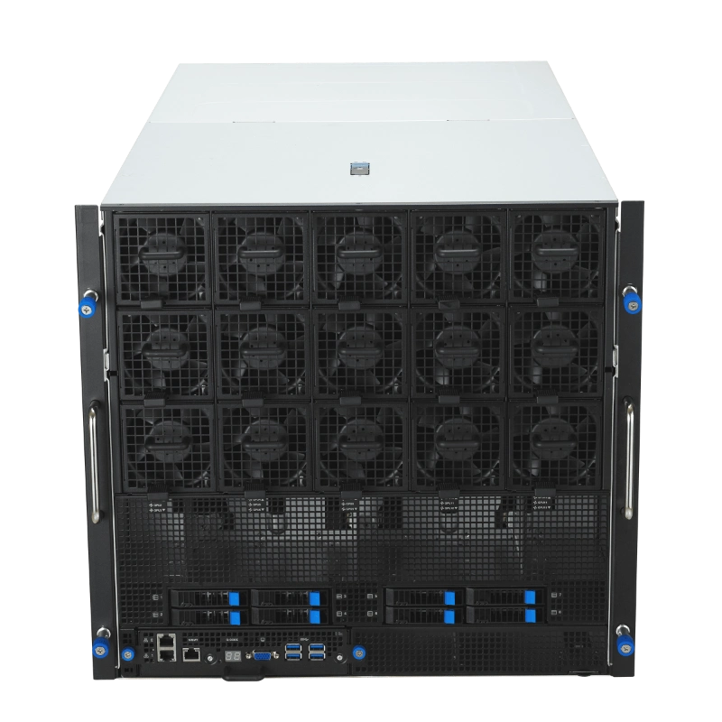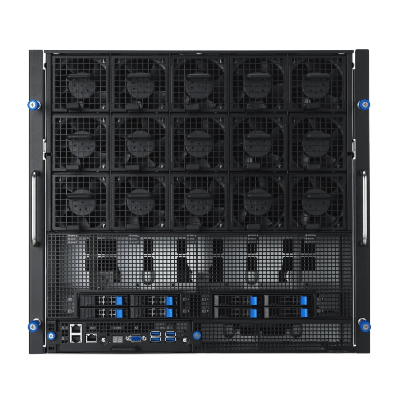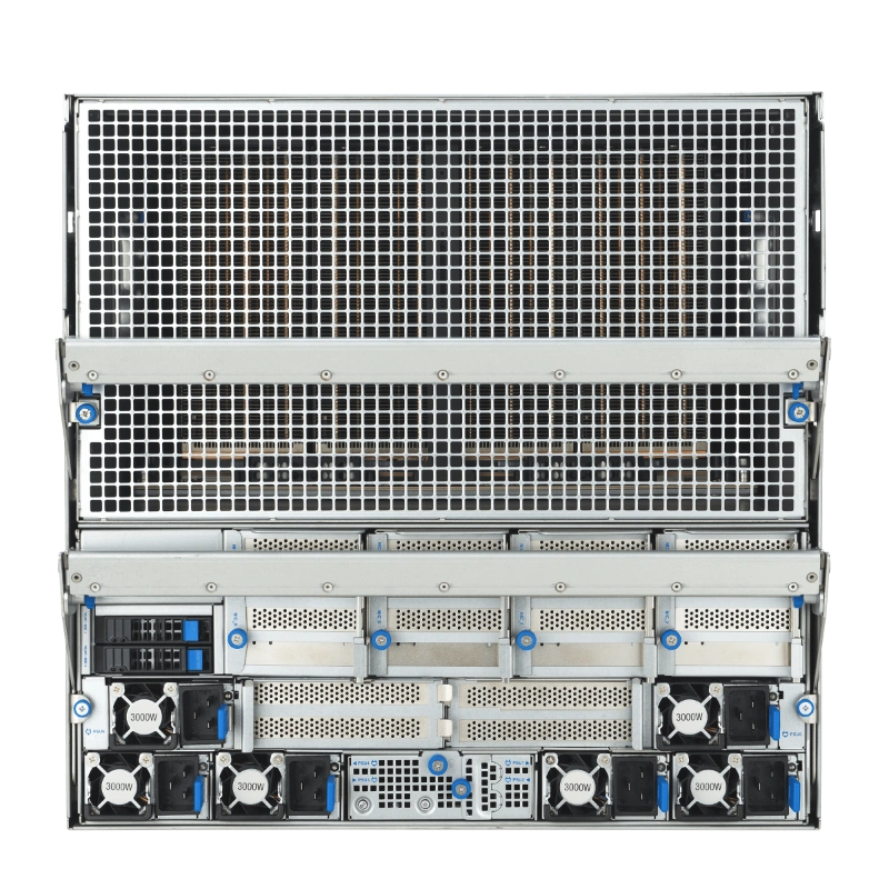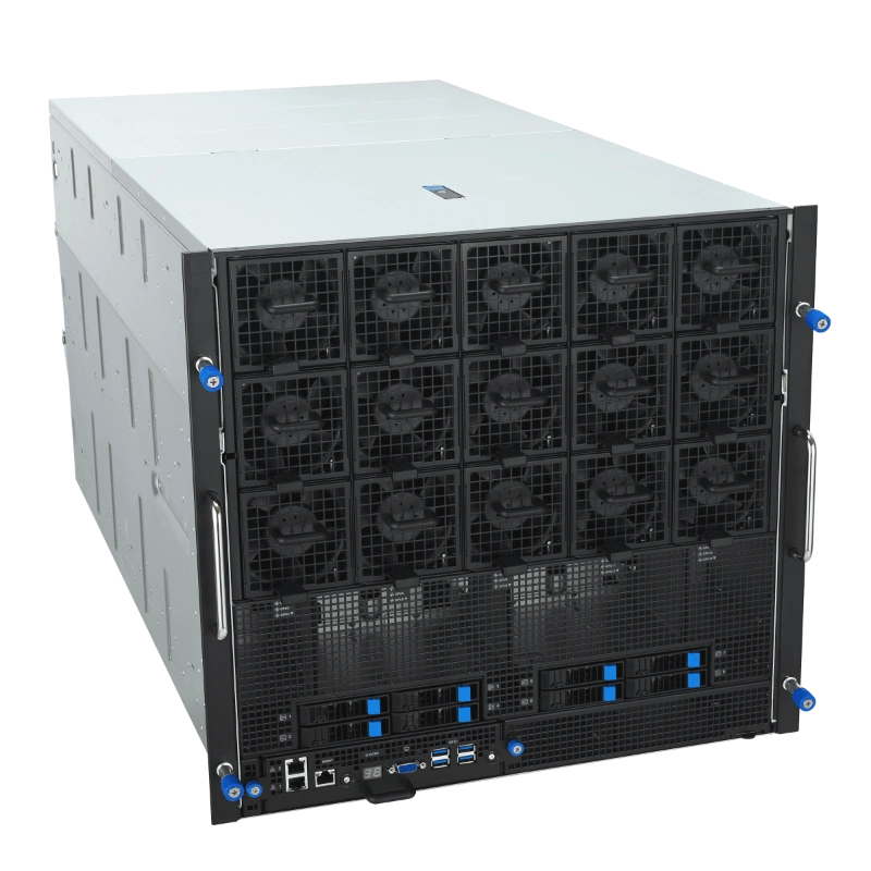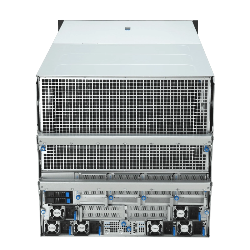 ESC NB8-E11 có định dạng 10U, phù hợp cho các trung tâm dữ liệu lớn. Bộ xử lý kép Intel Xeon Scalable thế hệ 5 hỗ trợ TDP 350W, kết hợp với 32 khe DIMM cho phép mở rộng bộ nhớ lên đến hàng terabyte, lý tưởng cho các mô hình AI lớn như Large Language Models (LLM) hoặc Mixture-of-Experts (MoE). Hệ thống lưu trữ bao gồm 10 ổ NVMe 2.5 inch hot-swap, cho phép thay thế nhanh chóng mà không gián đoạn hoạt động. Về kết nối, máy chủ trang bị mạng LAN kép 10Gb (RJ45, X710-AT2) và cổng quản lý riêng (RJ45), hỗ trợ các giao thức như IPMI và Redfish qua ASUS ASMB-iKVM. Các khe PCIe lên đến 11 cho phép tích hợp thêm các thành phần như DPU BlueField-3, nâng cao khả năng xử lý mạng và bảo mật.