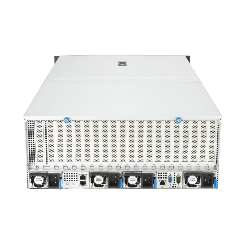ESC8000-E11P cũng được ASUS chú trọng để đảm bảo độ tin cậy và hiệu quả. Với form factor 4U, máy chủ dễ dàng lắp đặt vào rack tiêu chuẩn, phù hợp cho các trung tâm dữ liệu có không gian hạn chế. Hệ thống làm mát được tối ưu hóa với các đường hầm không khí độc lập cho CPU và GPU, giúp tản nhiệt hiệu quả dựa trên TDP của CPU. Điều này ngăn chặn tình trạng quá nhiệt, đặc biệt trong các workload kéo dài như huấn luyện AI. ESC8000-E11P hỗ trợ đến bốn nguồn điện Titanium 3000W redundant, đảm bảo hoạt động liên tục ngay cả khi một nguồn gặp sự cố. Hiệu suất năng lượng cao (Titanium certification) giúp giảm tiêu thụ điện, góp phần vào mục tiêu bền vững môi trường của các doanh nghiệp. Ngoài ra, mặt sau có tùy chọn module OCP 3.0 với khe PCIe 5.0, cho phép kết nối mạng tốc độ cao, hỗ trợ các giao thức như Ethernet 100Gbps hoặc InfiniBand, lý tưởng cho các hệ thống HPC yêu cầu băng thông lớn.