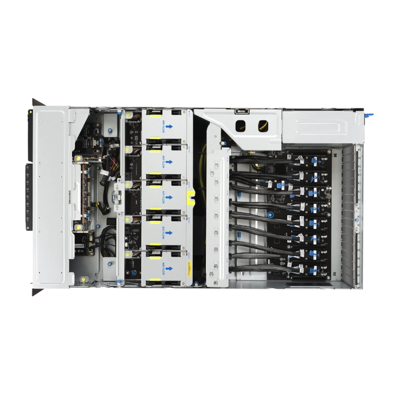 ESC8000A-E13 cung cấp sự linh hoạt cao. Hệ thống hỗ trợ lên đến sáu ổ cứng 2.5” U.2 NVMe, với chức năng RAID phần cứng để đảm bảo tính toàn vẹn dữ liệu và hiệu suất cao. NVMe là công nghệ lưu trữ nhanh nhất hiện nay, với tốc độ đọc/ghi vượt trội so với SSD SATA truyền thống, giúp giảm thời gian tải dữ liệu và tăng tốc độ xử lý. Ngoài ra, sản phẩm có hai khe PCIe® 5.0 kết nối trực tiếp với CPU, dành cho các card mạng băng thông cao (NICs) hoặc đơn vị xử lý dữ liệu (DPUs). Kết nối trực tiếp này giúp giảm độ trễ, rất quan trọng cho các ứng dụng thời gian thực như giao dịch tài chính hoặc streaming dữ liệu lớn. PCIe 5.0 mang lại băng thông gấp đôi so với PCIe 4.0, cho phép truyền dữ liệu nhanh chóng giữa CPU, GPU và các thiết bị ngoại vi. ASUS đã tối ưu hóa kết nối này để đảm bảo hiệu suất thấp nhất có thể, giúp ESC8000A-E13 trở thành lựa chọn hàng đầu cho các hệ thống yêu cầu kết nối mạng siêu tốc.