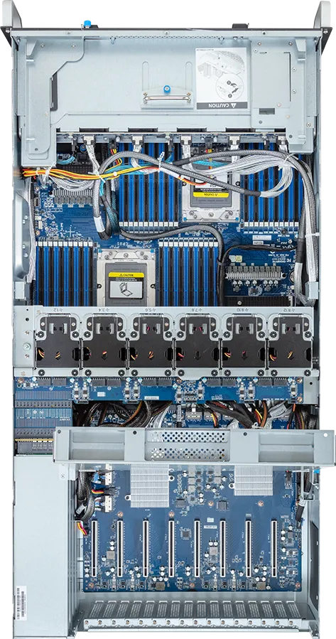 Việc tích hợp hệ thống 8 GPU HGX™ vào một khung máy 4U là một kỳ tích về kỹ thuật. GIGABYTE G493-ZB4-AAP1 được thiết kế với cấu trúc ngăn đôi thông minh: phần trên dành cho hệ thống CPU và lưu trữ, phần dưới dành riêng cho dàn GPU H100. Thiết kế này tạo ra luồng khí thẳng (Straight-through airflow), giúp giải nhiệt hiệu quả cho các linh kiện tiêu tốn hàng nghìn Watt điện mà vẫn giữ được kích thước gọn gàng cho tủ Rack.