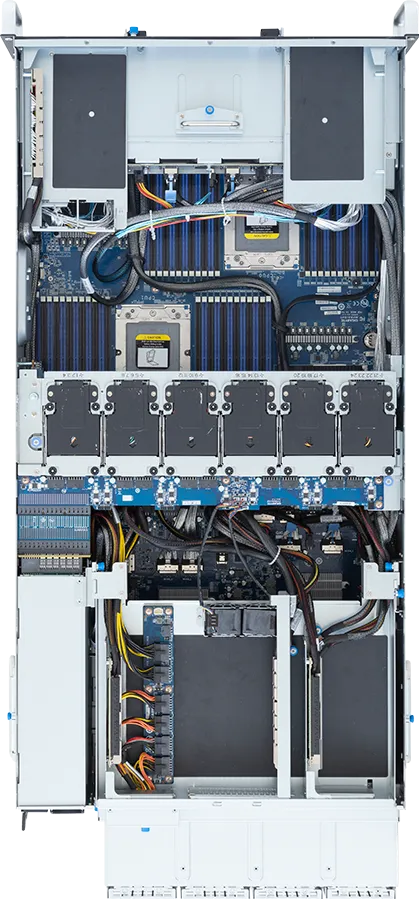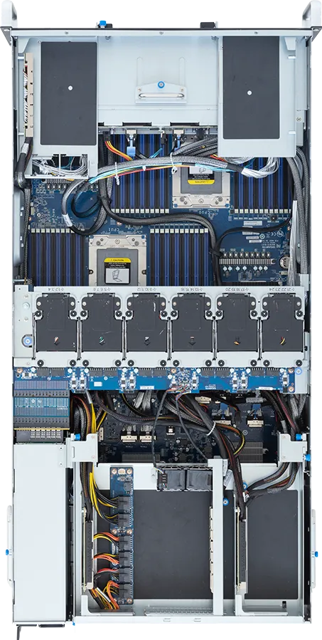 Để điều phối sức mạnh của 8 GPU H200, GIGABYTE trang bị cấu hình Dual-Socket hỗ trợ dòng vi xử lý AMD EPYC™ 9004 Series: