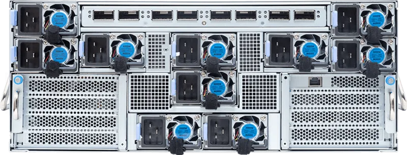 Lưu trữ NVMe Gen5: Phía trước máy là 8 khay ổ cứng 2.5″ hỗ trợ toàn diện Gen5 NVMe. Tốc độ đọc/ghi tuần tự vượt trội giúp việc nạp các tập dữ liệu (dataset) khổng lồ vào bộ nhớ diễn ra trong chớp mắt.