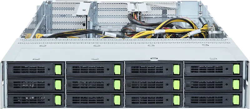 Giải pháp làm mát tối ưu: Hệ thống quạt hiệu suất cao với thiết kế luồng khí (Airflow) thông minh, đảm bảo duy trì nhiệt độ ổn định cho cả 2 CPU và dàn 24 ổ cứng NVMe dày đặc phía trước, ngay cả khi vận hành ở mức tải tối đa 24/7.