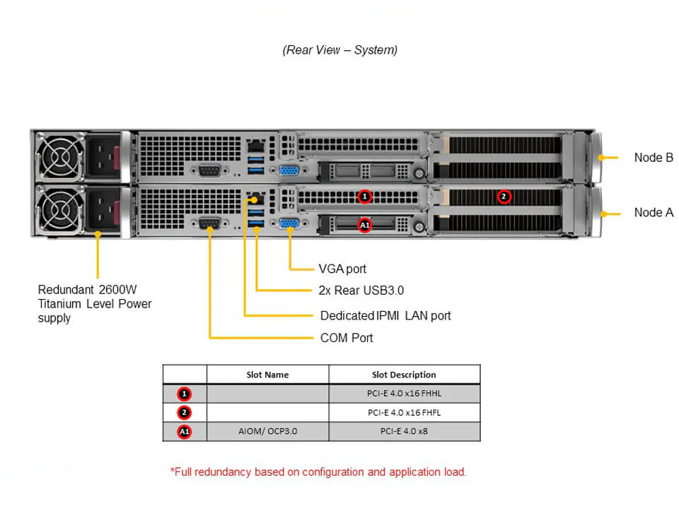 2 bộ nguồn 2600W 80 PLUS Titanium: Hệ thống nguồn dự phòng 1+1 được thiết kế để cấp điện cho cả hai node. Hiệu suất Titanium (trên 96%) giúp giảm thiểu nhiệt lượng tỏa ra và tiết kiệm điện năng vận hành đáng kể.
