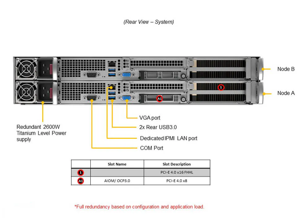 2 bộ nguồn 2600W 80 PLUS Titanium: Cấu hình dự phòng 1+1 Redundant dùng chung cho cả hai node. Hiệu suất Titanium giúp giảm tối đa hao phí điện năng thành nhiệt năng, giúp hệ thống chạy mát hơn và bền bỉ hơn.