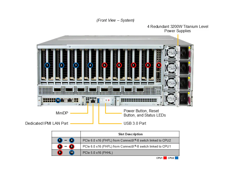 Hỗ trợ 4 GPU Dual-slot (mỗi Node): Tổng cộng cả hệ thống hỗ trợ 8 GPU công suất lớn như NVIDIA L40S hoặc RTX 6000 Ada.