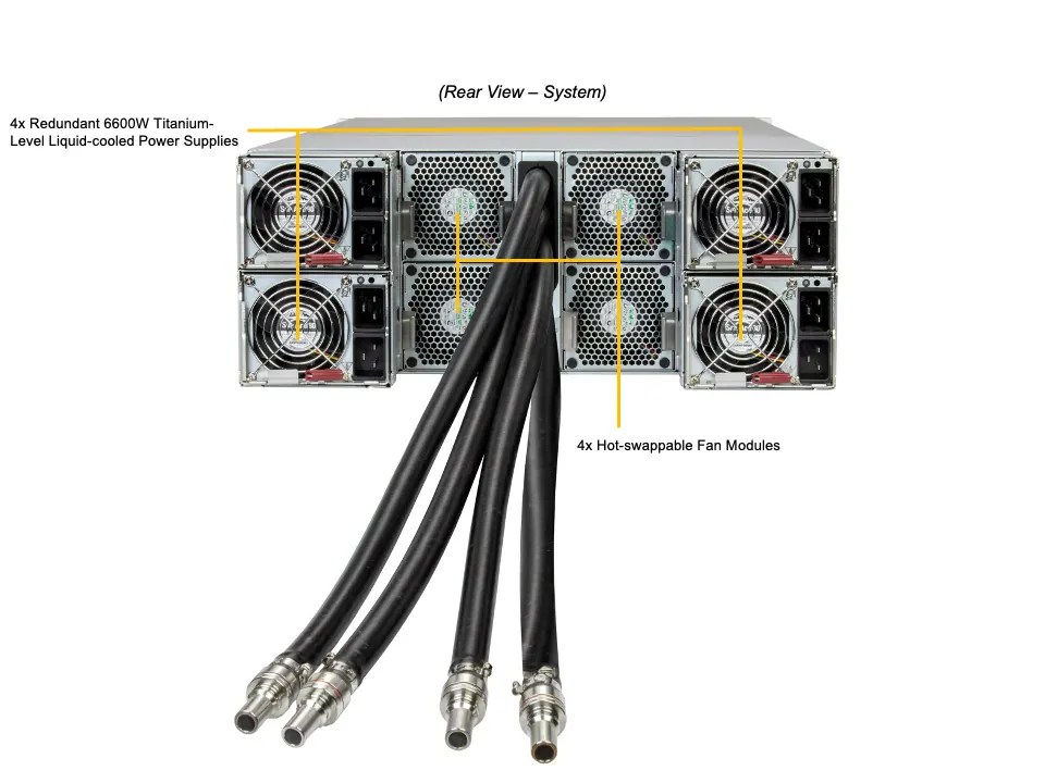 Nguồn 3000W 80 PLUS Titanium: Cấu hình dự phòng (thường là 3+1 hoặc tương đương) giúp đảm bảo hệ thống luôn chạy ổn định. Hiệu suất Titanium (trên 96%) giúp tối ưu hóa chi phí điện năng tổng thể.