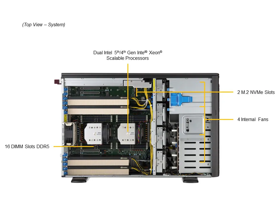 Hỗ trợ 4 GPU Dual-slot: Bạn có thể lắp đặt những dòng card mạnh nhất hiện nay như NVIDIA L40S, RTX 6000 Ada hoặc các dòng chuyên sâu như NVIDIA H100 (PCIe).